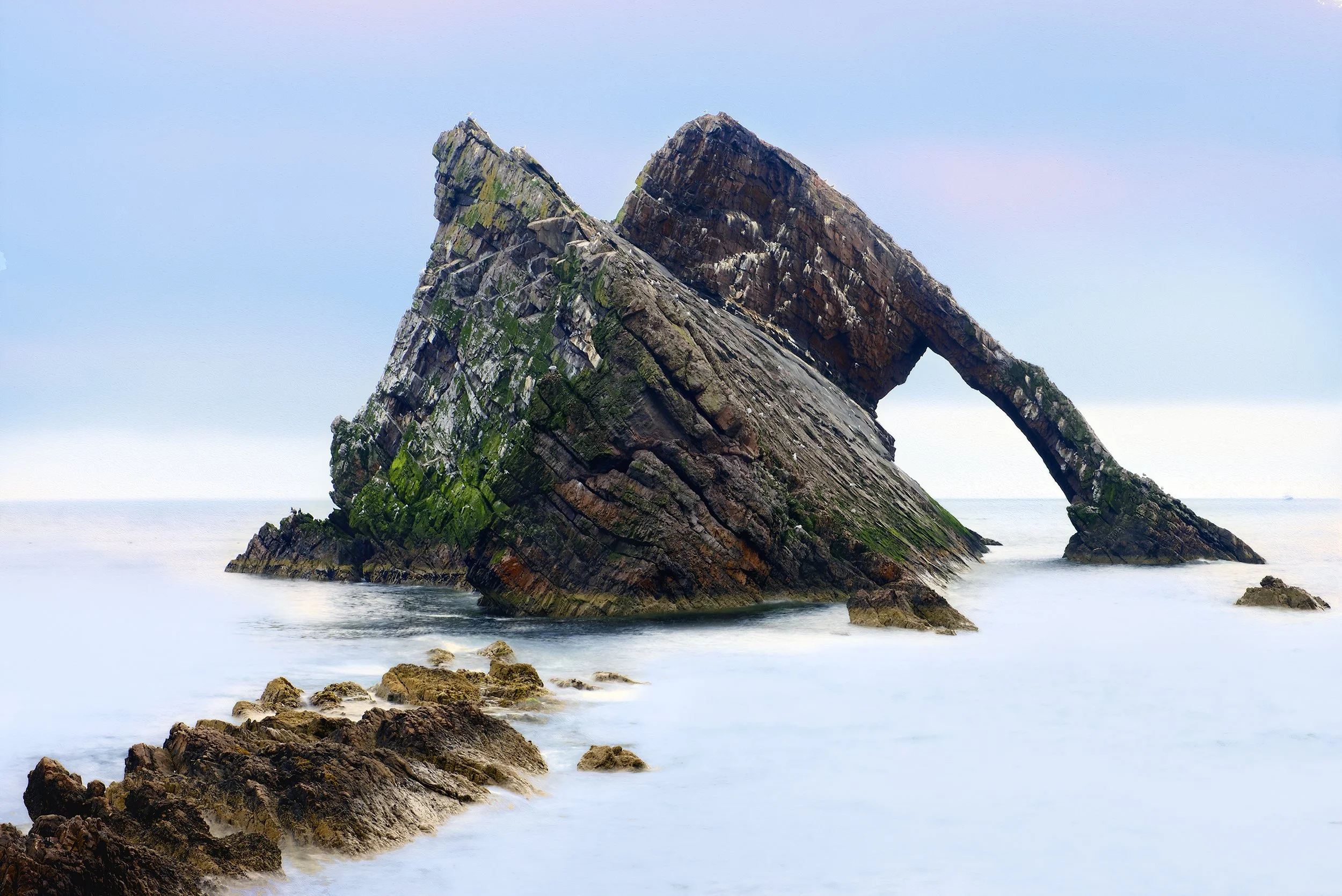 Bow Fiddle Rock, a stunning natural arch-shaped rock formation in northeastern Scotland, near Portknockie and Moray. Many photographers are drawn to this coastal location for its breathtaking views. If you have the opportunity to visit this coast, you'll have an unforgettable experience.
